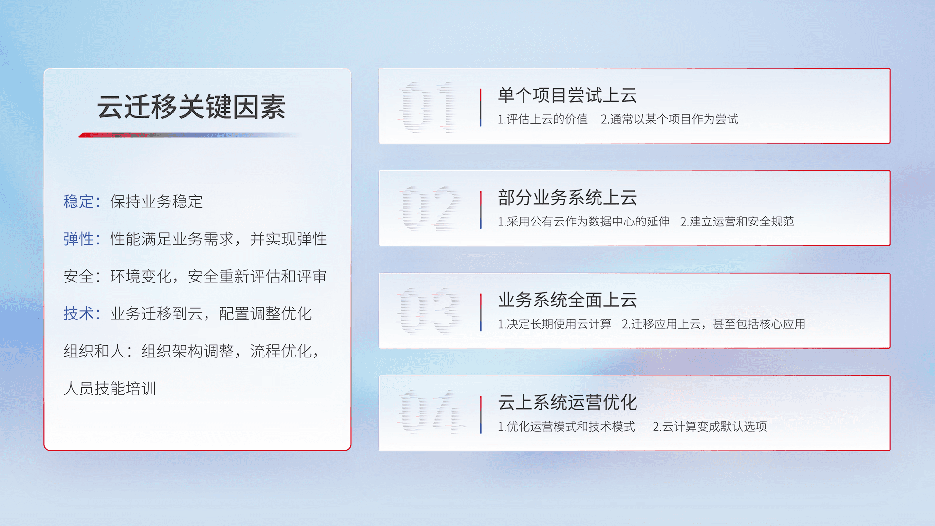 结合实际业务,,,从规划设计、、、、云平台选型、、云原生改造、、、数据迁移、、、、集成交付,,迁移全过程为客户识别最佳上云路径,,做好风险识别管理,,设计网络架构、、、身份权限、、、、安全审计合规、、操作审计、、、、日志审计、、、监控告警策略、、多站点容灾设计等,,,对云上基础设施进行整体规划,,,,提升IT治理水平,,以满足弹性、、、高可用、、、、高性能的需求。。
